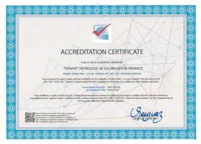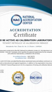 Laboratuvarımız, NAC (National Accreditation Center) tarafından TS EN ISO/IEC 17025'e göre akredite edilmiştir. Bu bağlada akreditasyon, müşterilerimize sunduğumuz hizmetlerin uluslararası standartlara uygunluğunu ve güvenilirliğini garanti etmemize yardımcı olmaktadır. Biz, endüstriyel ve biyomedikal alanda ölçümün güvenilirliği ve doğruluğunun her zaman önemli olduğunu kabul ederiz. Bu nedenle, sizlere en iyi hizmeti sunarak işinizin başarısına katkıda bulunmayı taahhüt ediyoruz. Laboratuvarımız Tüm Türkiye genelinde hizmet vermeye devam ediyor. Bizi tercih ettiğiniz için teşekkür ederiz ve gelecekteki başarılarınızda sizlere yardımcı olmaktan mutluluk duyarız...